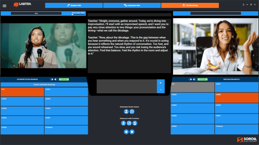 Para llevar a cabo las actividades de interpretación, el docente también dispone de un pupitre virtual propio, similar al de los estudiantes, que le permite hablar en sala, actuar como relay o monitorizar en doble canal tanto la fuente original como las interpretaciones realizadas en cabina. Esta versatilidad facilita una gestión precisa y dinámica del aula, optimizando el proceso de enseñanza-aprendizaje.